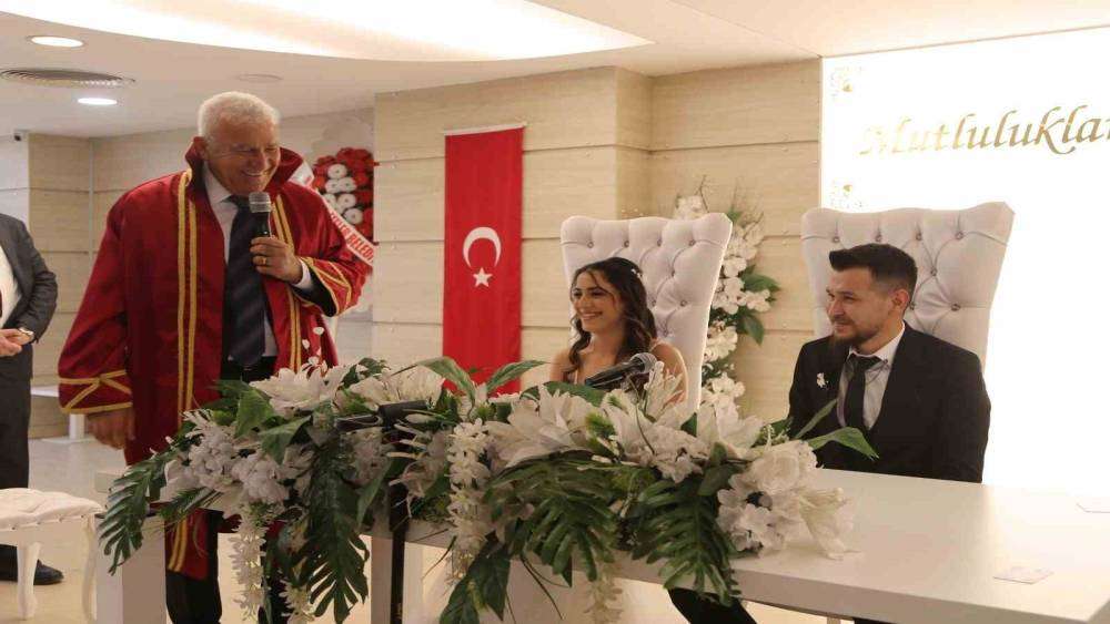 Efeler Belediyesi Nikah Dairesi’nde düzenlenen törende Başkan Mehmet Fatih Atay, evlilik cüzdanını Buket Aksoy’a takdim ederek, “Siz talep etmediğiniz halde, hoş bir sürpriz yaparak bu anlamlı günde özellikle nikahınızı ben kıymak istedim. Aile cüzdanını Buket’e veriyorum çünkü kadınların yuvayı iyi bir şekilde yönettiği zaman o yuvanın başarıya ulaşmaması için hiçbir neden yoktur. Mutluluklar diliyorum. Tıpkı sizin ailelerinizin sizleri yetiştirdiği gibi çağdaş, Atatürk ilkelerine inanmış, Cumhuriyet’i seven ve sahip çıkan evlatlar yetiştirmenizi diliyorum” diye konuştu.