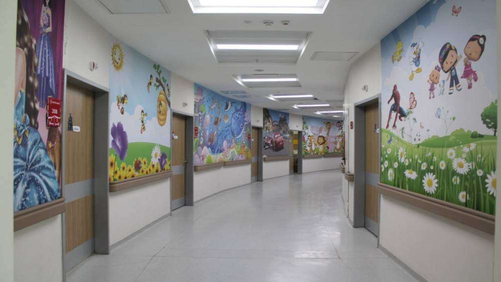 Hasta çocukları çocuk servisi duvarlarındaki kocaman çizgi film karakterleri karşılıyor