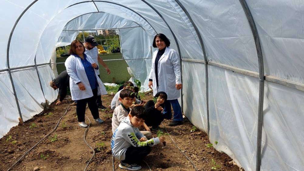 Sabancı İlkokulu öğretmenlerinden Serap Irmak, örnek bir uygulamayla öğrencileriyle birlikte geçen sene okul bahçesini meyve ağaçları ile donatmıştı. Bu yıl da yine okul idaresiyle birlikte okul bahçesine bir sera kurulmasını sağlayan Irmak, öğrencileri için mini bir örtü altı üretim modeli oluşturdu.