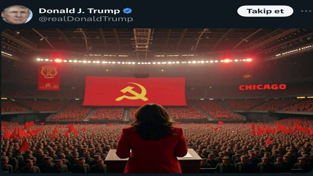 Trump son olarak X hesabından rakibi Kamala Harris’i hedef alarak yapay zeka tarafından oluşturulan görselini paylaştı. Yapay zeka ile hazırlanmış görsellerde Demokratların adayı Kamala Harris’in Sovyet bayrağıyla komünist mitingi düzenlediği görülüyor.