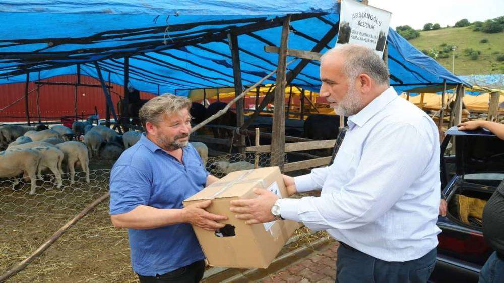 Canik ilçesinde kurulan canlı hayvan pazarını ziyaret eden Belediye Başkanı İbrahim Sandıkçı, kurbanlık hayvan yetiştiricilerine hijyen paketi verdi.