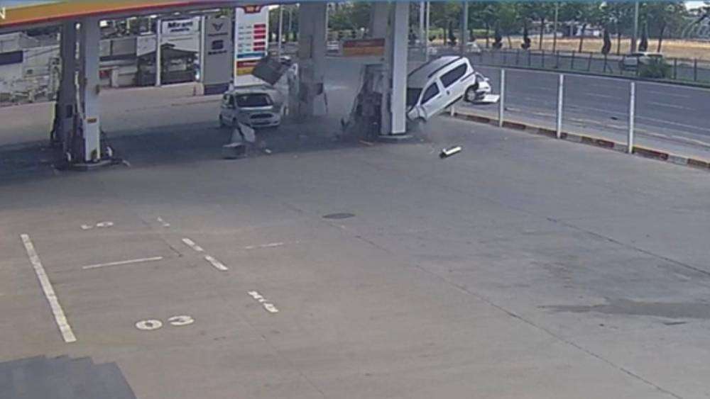 Diyarbakır’ın Yenişehir ilçesinde çarpışan iki araçtan birinin petrol istasyonuna dalma anı güvenlik kamerasına yansıdı.