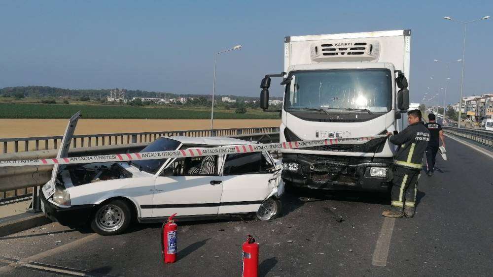 Kaza, Antalya-Alanya D-400 Karayolunda yaşandı. Edinilen bilgiye göre, Antalya istikametinden Alanya istikametine gitmekte olan Muhammed Bayram’ın kullandığı 51 ES 311 plakalı TOFAŞ Şahin marka otomobile, Manavgat Çevreyolu Sanayi Köprülü kavşağında Bilal Aydoğan’ın kullandığı 34 FOD 022 plakalı kamyonun arkadan çarptı.