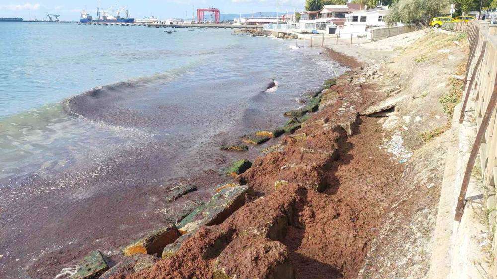 Tekirdağ’da denizin kıyıları esen poyraz sebebiyle kızıl yosunlarla kaplandı.