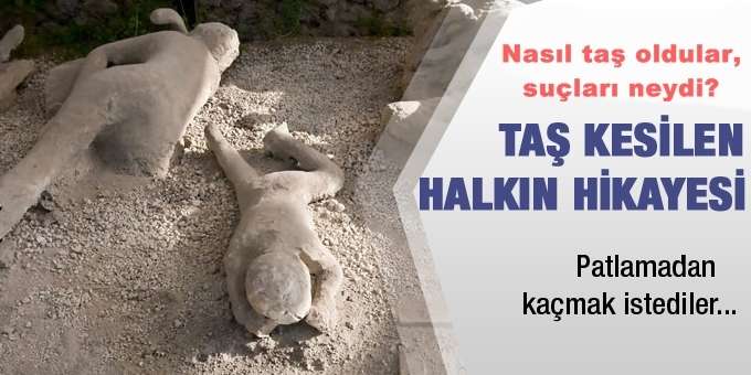 Taş kesilen şehir Pompei Jeologlara göre halkın ölüm sebebi kükürt gazı. Taşa dönmelerinin sebebi ise yanardığın püskürttüğü volkanik tozun sertleşmesi… Bu lavlar kalıp oluşturmuş, zamanla içerdeki vücut çürümüş fakat kalıp aynı kalmıştır..