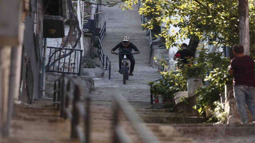 Bursa’da downhill sporcusu 225 basamaklı dik merdivenden bisikletle inişiyle yürekleri ağza getirdi. Uludağ’ın eteklerindeki en dik ve en uzun merdivenlerden saniye içerisinde inen genç sporcu o anları saniye saniye kaydetti.