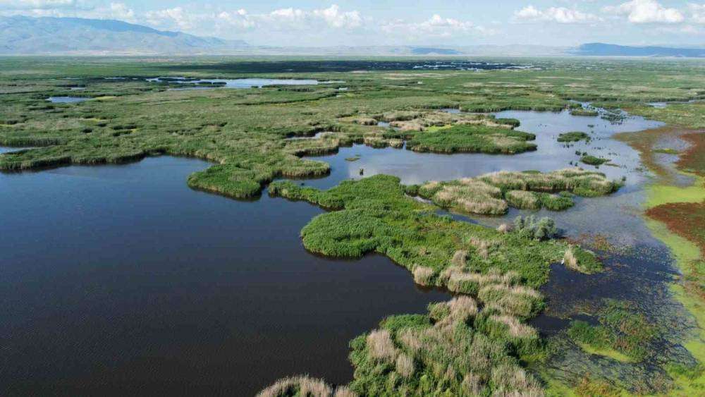 Türkiye’nin en büyük göllerinden biri olan ve Afyonkarahisar’ın Bolvadin sınırları içerisinde kalan Eber Gölü’nde su seviyesini yükselmesi ile adacıklar ön plana çıkarken, havadan çekilen görüntüler ise gölün eşsiz güzelliğini gözler önüne serdi.Bolvadin sınırları içerisinde kalan Eber Gölü’nde yağışlı geçen dönemin ardından su seviyesi arttı.Son yıllarda kuraklık ve kamış yangınları ile gündeme gelen Eber Gölü baharda aldığı yağmur yağışı ile eski günlerine kavuşmaya başladı. Gölün kuruyan birçok noktasında yağan yağışların ardından su birikintileri oluşmaya başlarken, gölün su sınırlarının da gözle görülür bir şekilde genişlediği dron ile havadan görüntülendi. Su seviyesinin artması ile göldeki adacıklarda ön plana çıktı. Teknelerle gezinti yapılmaya başlanan gölde bu duruma en çok sevinenler ise geçimini kamış toplayarak sağlayan köylüler oldu.Eber Gölü Kılavuz ve Rehberi Kadir Ateş, bu sene yağışların bol olması ile göldeki su seviyesinin son 3 yılın zirvesine ulaştığını kaydetti. Ateş, “Geçen yıllarda su olmayan yerlerde bu sene yarım metreye kadar su var. Gölde yüzde 25-30 seviyesinde bir su artışı var diyebiliriz. Bu da göldeki canlı popülasyonu arttırmakta” dedi.
