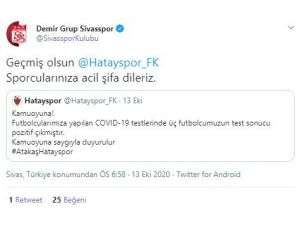 DG Sivasspor Kulübü, korona virüs testinde 3 oyuncusu pozitif çıkan Hatayspor'a geçmiş olsun mesajı yayımladı.Kırmızı-beyazlıların sosyal medya hesabından yayımlanan mesajda, "Geçmiş olsun Hatayspor Futbol Kulübü. Sporcularınıza acil şifa dileriz" ifadesine yer verildi.