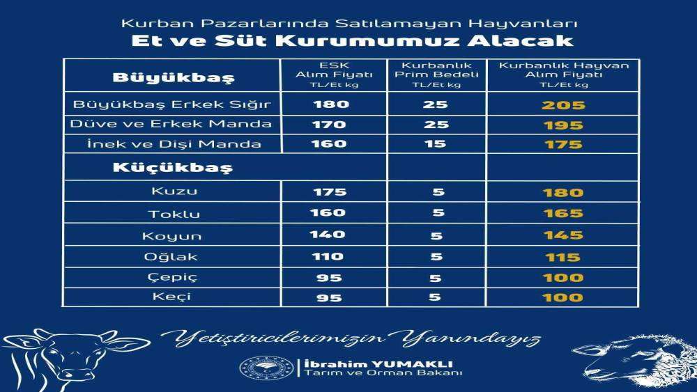 Tarım ve Orman Bakanı İbrahim Yumaklı, sosyal medya hesaplarından yaptığı paylaşımda, Kurban Bayramı nedeniyle yetiştiriciler tarafından hayvan pazarlarına getirilen ancak satılamayan kurbanlıkların, talep etmeleri halinde Et ve Süt Kurumu tarafından satın alınacağını bildirdi. Bakan Yumaklı, “Hayvansal üretimimize güç katan yetiştiricilerimizin her daim yanında olmaya devam edeceğiz” ifadelerine yer verdi.